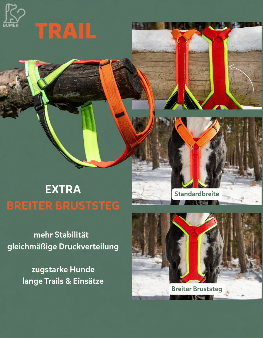 Bei BUMER entstehen Geschirre, die perfekt passen. In Standardgrößen oder individuell nach Maß für deinen Hund gefertigt.