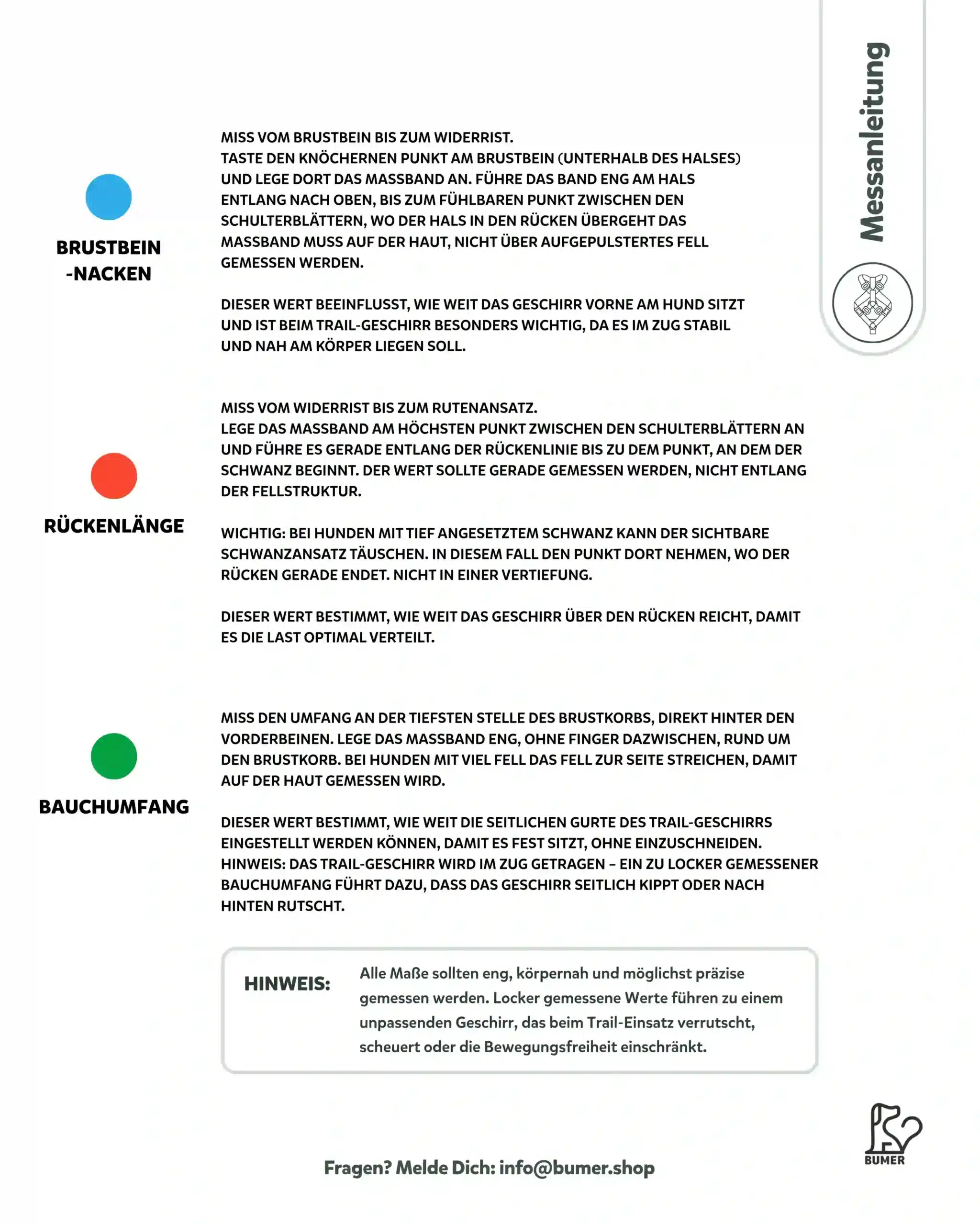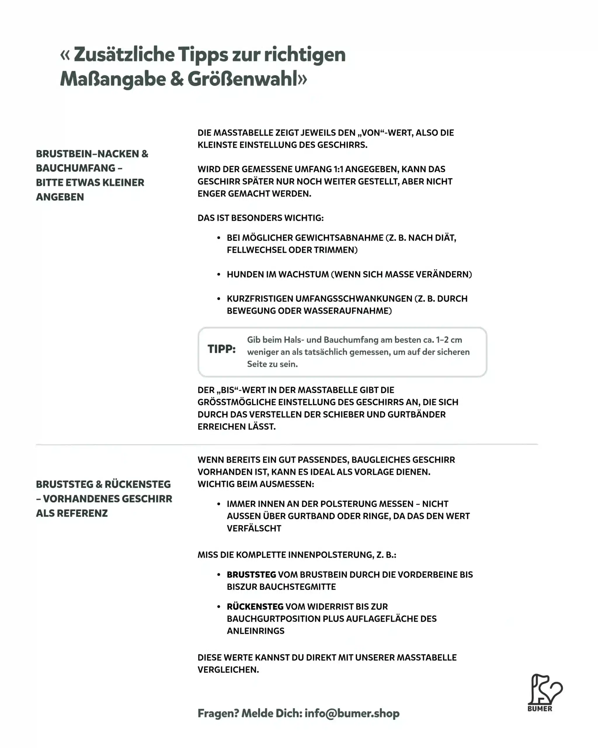 Um die optimale Passform unserer Hundegeschirre zu gewährleisten, findest du hier alle relevanten Maßtabellen und Messanleitungen