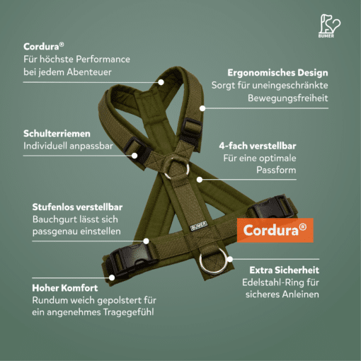 Dieses Geschirr ist für echte Abenteuer und viel Bewegung gemacht. Außen original CORDURA®, extrem strapazierfähig, wasserabweisend und sehr schnell trocknend. Ein Material, das entwickelt wurde, um Belastung standzuhalten, ob auf Waldwegen, im Gelände, im Matsch oder bei langen Touren.